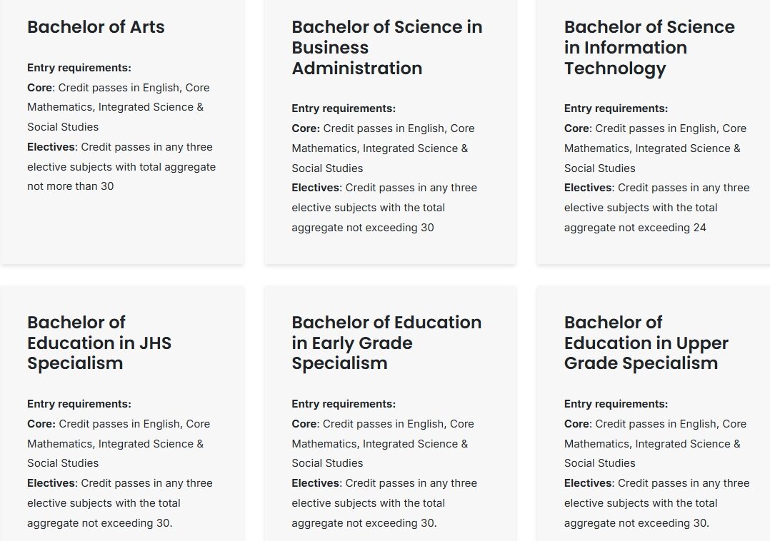 The university offers admission to students interested in distance learning programmes at the various University of Ghana Regional Centres. This includes WAEC entrants to degree, Mature entrants. Degree and Diploma related programmes are offered here.